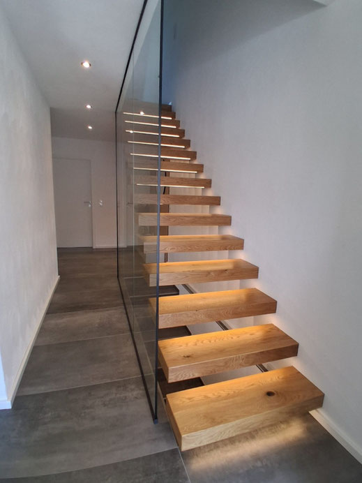 eine schwebende, sehr elegante und natürliche Anmutung. Das ist in vielen Fällen die ideale Form bzw. Umsetzung für eine Treppe.