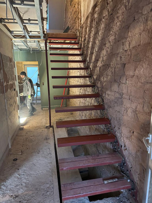 Die massive Stahlunterkonstruktion wurde passgenau in die bestehende Wand eingearbeitet und dient als stabile Basis für die später montierten Stufen.