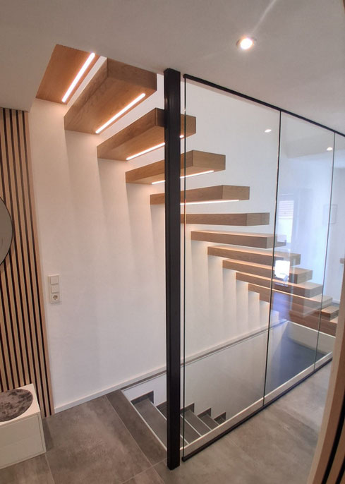 eine schwebende, sehr elegante und natürliche Anmutung. Das ist in vielen Fällen die ideale Form bzw. Umsetzung für eine Treppe.