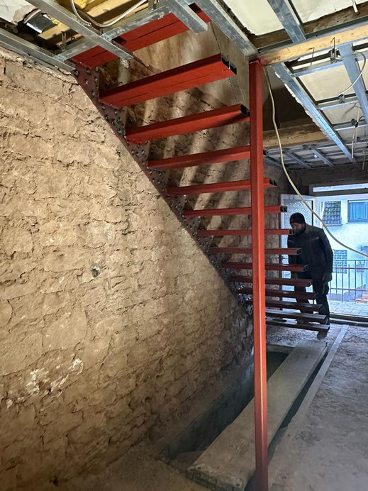 Die massive Stahlunterkonstruktion wurde passgenau in die bestehende Wand eingearbeitet und dient als stabile Basis für die später montierten Stufen.