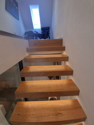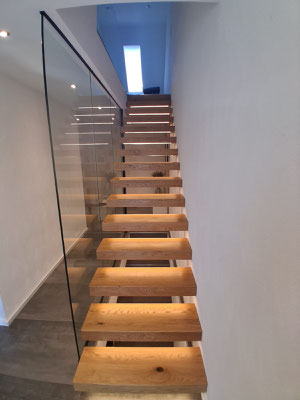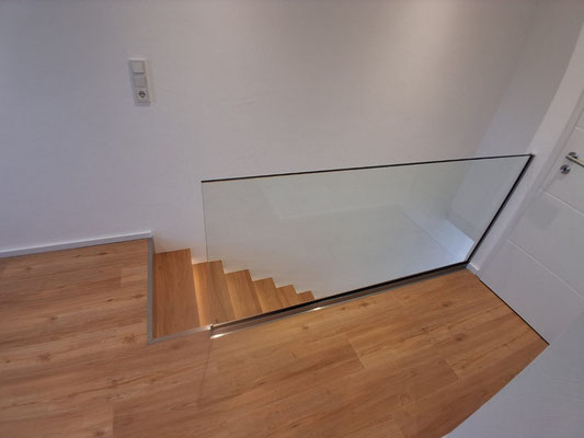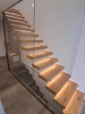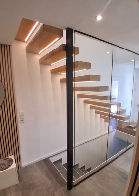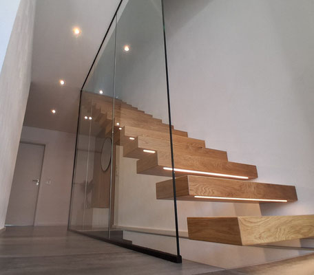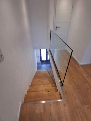 Die tragende Stahlkonstruktion wurde präzise in die Wand integriert und bildet das stabile Fundament für massive Eichenstufen, die dank unsichtbarer Befestigung frei im Raum schweben. Ein rahmenloses Ganzglasgeländer unterstreicht den offenen, lichtdurchfluteten Charakter und sorgt gleichzeitig für maximale Sicherheit.