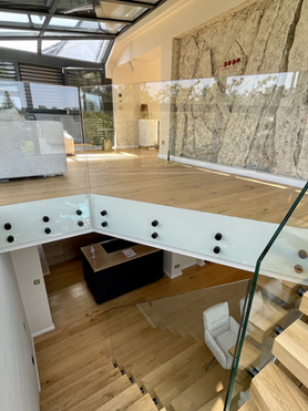 Die schwebenden Stufen wirken leicht und elegant, während das warme Eichenholz und das klare Glas ein harmonisches, modernes Gesamtbild schaffen