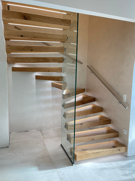 Moderne Kragarmtreppe aus massiver Eiche – mit integrierter LED-Beleuchtung und Ganzglasgeländer für maximale Transparenz.