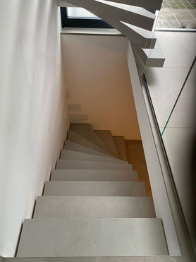 Hier haben wir eine alte Holztreppe komplett demontiert und durch eine Kragarmtreppe ersetzt, deren Stufen aus den vorhandenen Fliesen des Kunden gefertigt wurden. So fügt sich die Treppe perfekt ins bestehende Raumkonzept ein und wirkt wie aus einem Guss.